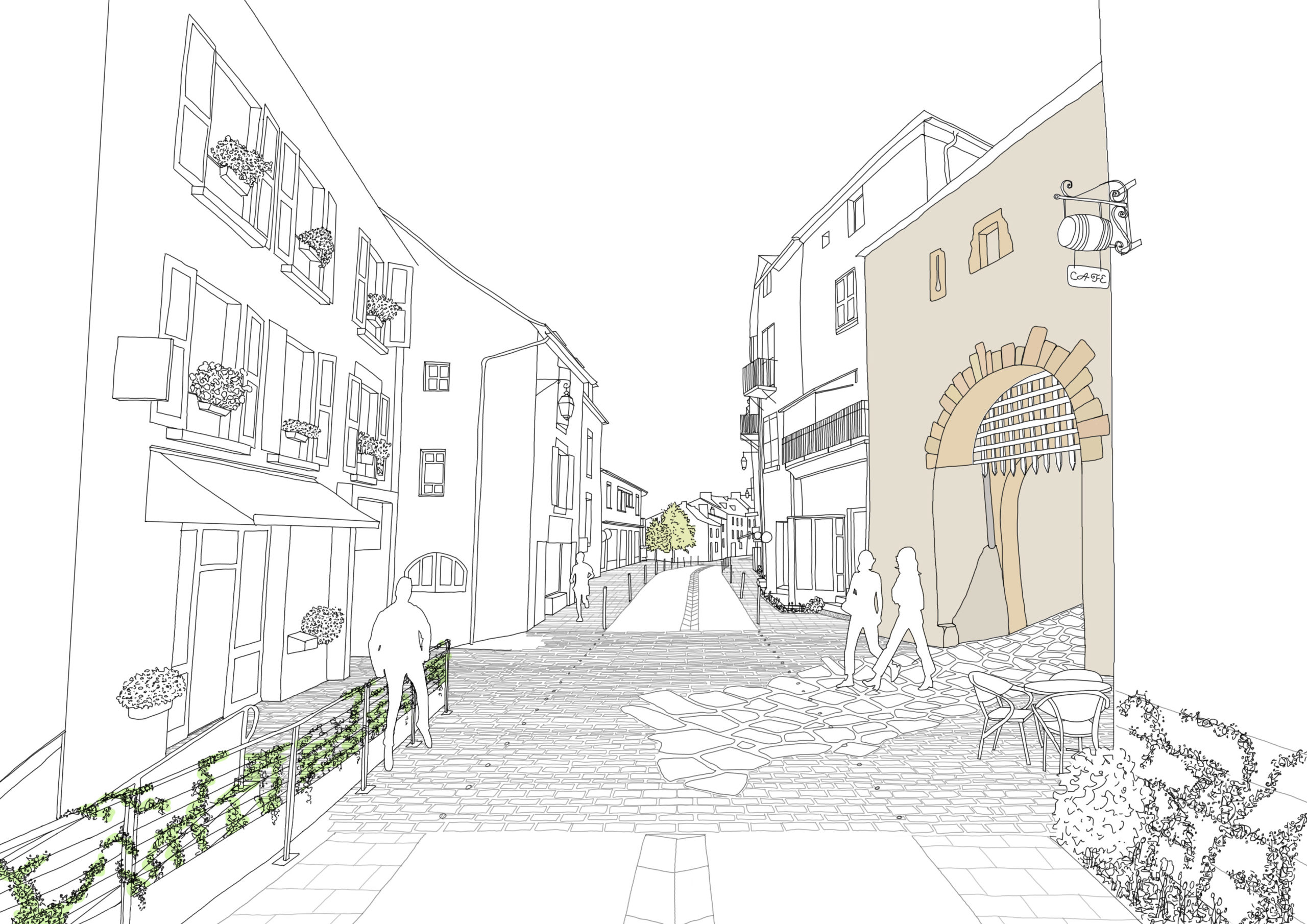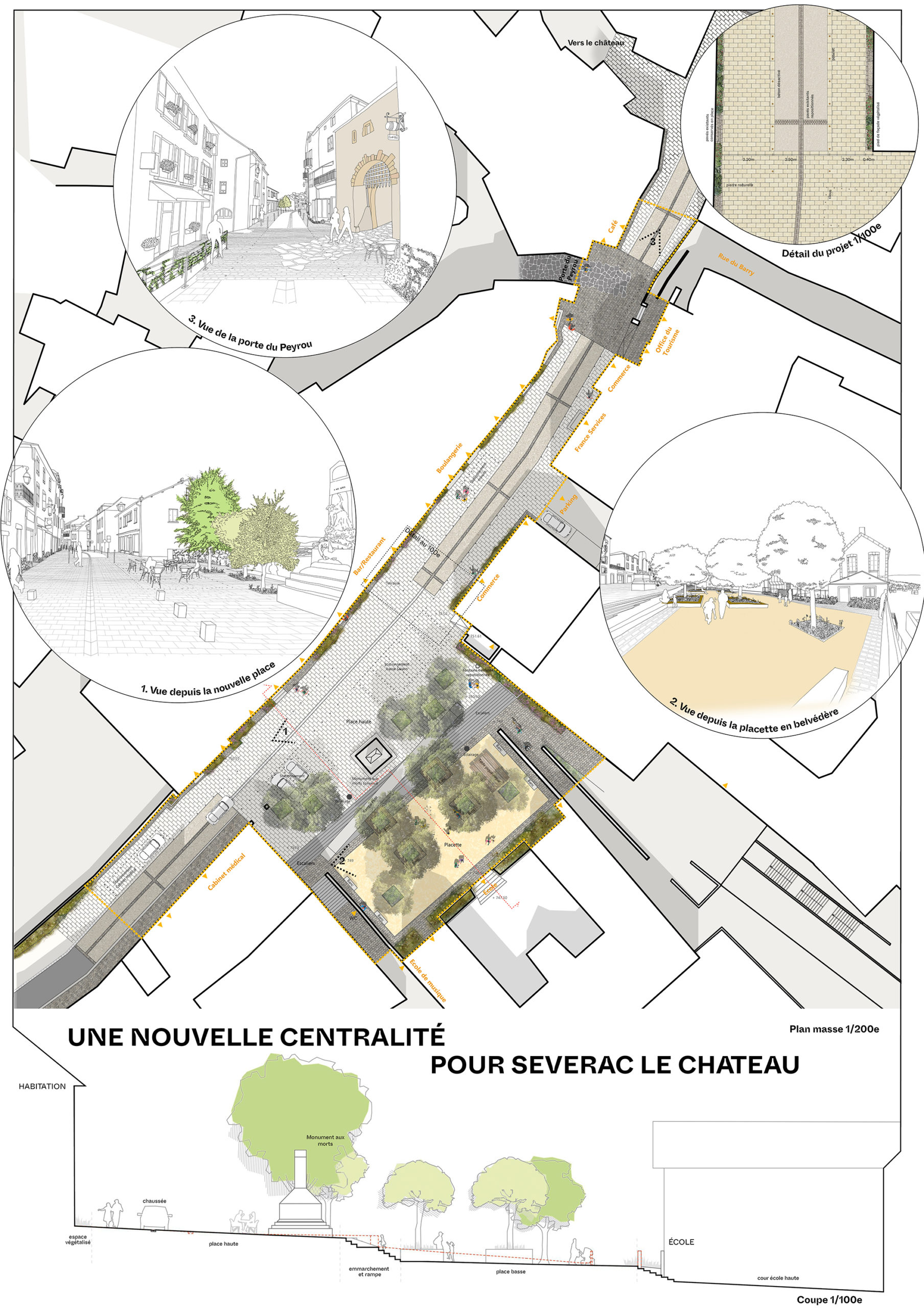 Comme toujours chez ex&terra, nous avons proposé de dézoomer pour regarder le fonctionnement élargi de la Commune, et pris le temps de regarder le futur de Séverac en termes de mobilités, usages, tourisme... Nous avons ainsi repensé les accès au centre ancien et les secteurs de stationnement pour les touristes, afin de pouvoir imaginer une place réellement piétonne.